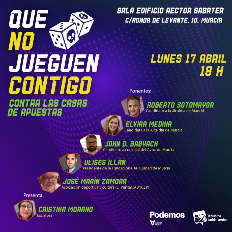Convocamos a los medios de comunicación para ofrecer una rueda de prensa en el Salón de Actos del Edificio Rector Sabater de la Universidad de Murcia (Ronda de Levante), previo a la celebración del acto “Que no jueguen contigo. Contra las casas de apuestas”.