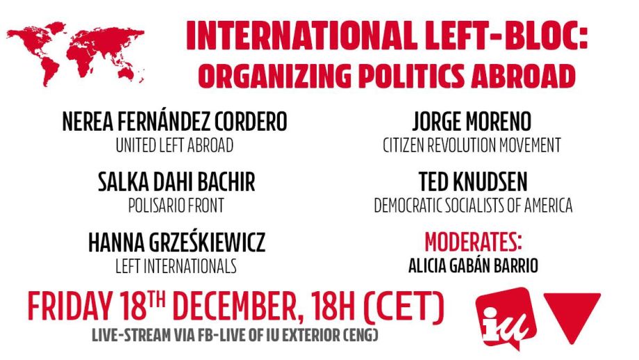 La federación de Izquierda Unida en el Exterior (IU Exterior) debatirá este viernes, 18 de diciembre, a las 18:00 horas (CET), junto a otras organizaciones de izquierdas a nivel internacional sobre cómo organizarse políticamente desde la emigración y cómo establecer vínculos con organizaciones políticas hermanas. El encuentro contará con la participación de Ted Knudsen (Democratic Socialists of America, EEUU)Salka Dahi Bachir (Frente Polisario, Sáhara)Hanna Grzeskiewicz (Left Internationals, Alemania)Jorge Moreno (Movimiento Revolución Ciudadana, Ecuador) y Nerea Fernández (IU Exterior, España)