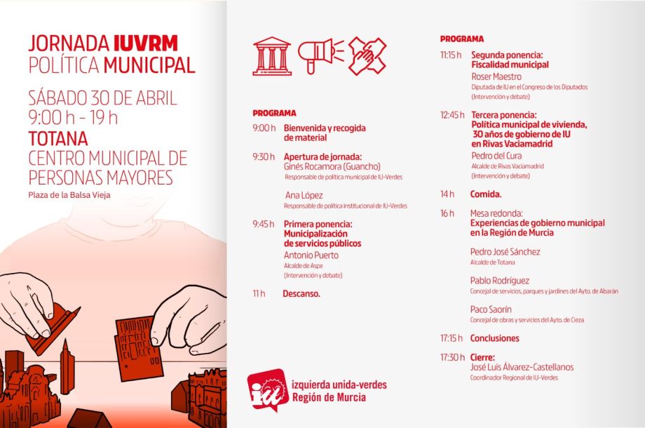 El responsable de política institucional de IUVRM, Ginés Rocamora, describe que: “Contaremos con tres ponencias: la primera la dirigirá Antonio Puerto, alcalde de Aspe, y versará sobre la política de remunicipalización de los servicios públicos, uno de los objetivos por los que más se ha trabajado en la coalición de izquierdas. En segundo lugar, intervendrá Roser Maestro, diputada valenciana en el Congreso, que compartirá su experiencia en cuestiones de justicia social materializadas en fiscalidad municipal. Y en un tercer momento, Pedro del Cura, alcalde de Rivas Vaciamadrid, pondrá sobre la mesa la larga experiencia de 30 años de este municipio en el ejercicio del derecho a la vivienda”.