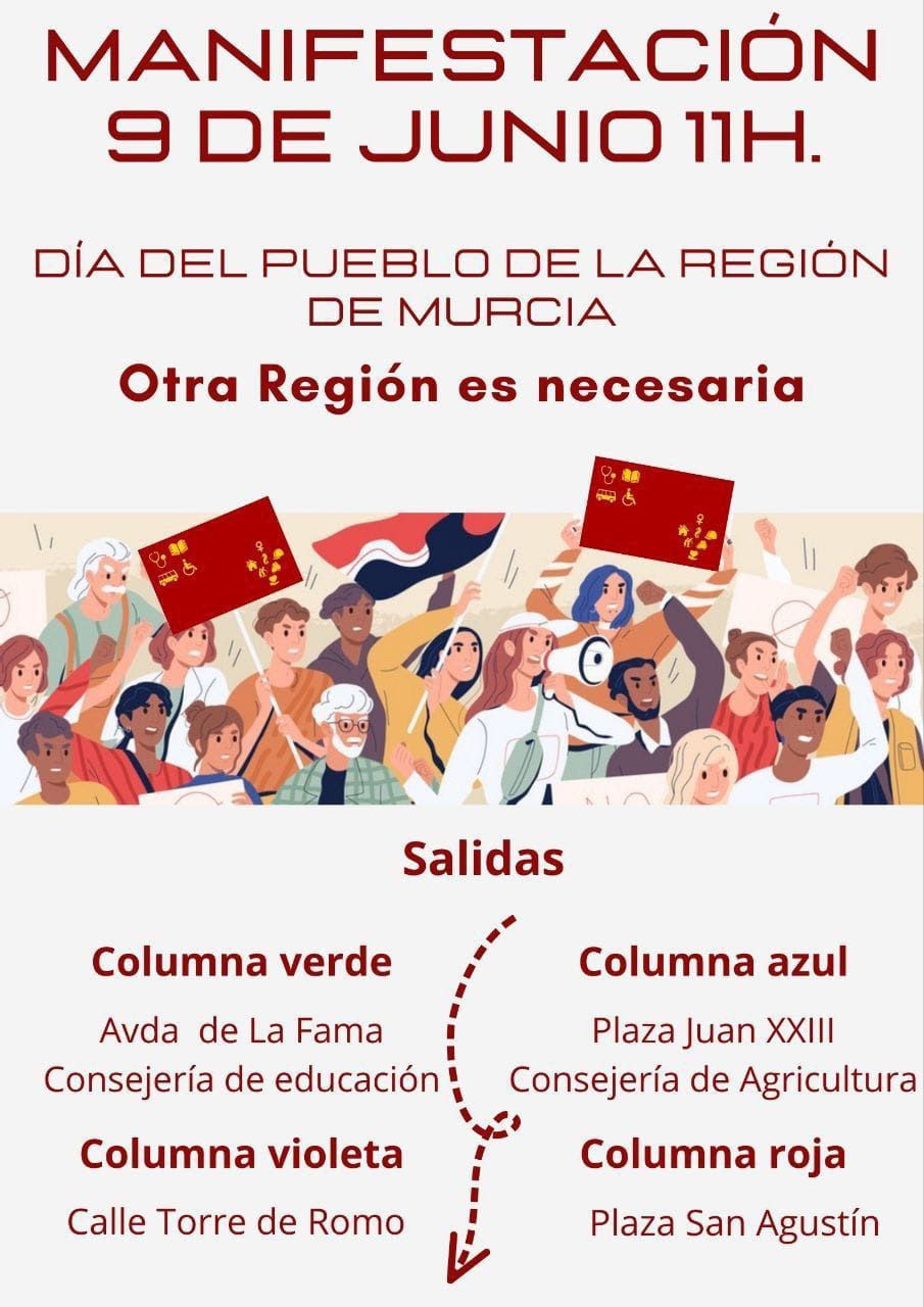La Plataforma Unitaria de las Marchas de la Dignidad que agrupa a más de 80 organizaciones, como sindicatos de clase, partidos políticos de la izquierda y organizaciones sociales y ecologistas, y en la que IU-Verdes participa de manera activa y comprometida, ha convocado una nueva MANIFESTACIÓN DEL 9 J, Día del Pueblo de la Región de Murcia, con el lema «Otra Región es necesaria».