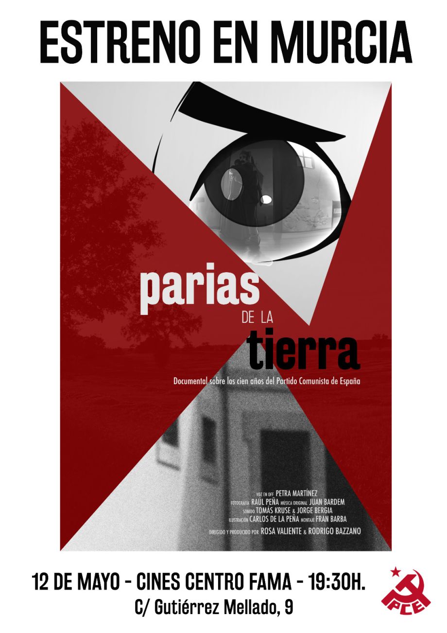 A la proyección acudirán miembros del PCE de la Región de Murcia, su secretario regional Jose Ángel Durán, los propios protagonistas Inés y Paco y representantes de la dirección central del Partido como Mauricio Valiente secretario de memoria democrática del PCE.Las entradas ya se pueden comprar en: https://www.neocine.es/a/3039/parias-de-la-tierra