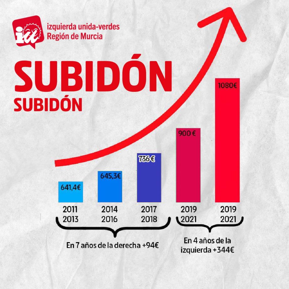 Región de Murcia, 2 de febrero de 2023.- IU-Verdes Región de Murcia ha destacado que con las últimas 7 subidas por un valor de 344 euros (un 47%) el salario mínimo interprofesional se ha incrementado desde los 735 euros que se pagaban en 2018 con el PP hasta los 1.080 euros que se van a pagar en 2023 cuando el Consejo de Ministros dé luz verde a la última subida, acordada este martes entre el Gobierno y los principales sindicatos. La ministra de Trabajo, Yolanda Díaz, ha alcanzando seis acuerdos en diálogo social en menos de cuatro años (muchos de ellos con la firma de la CEOE) para que el salario mínimo pasara de los 900 hasta los 1.080 euros.