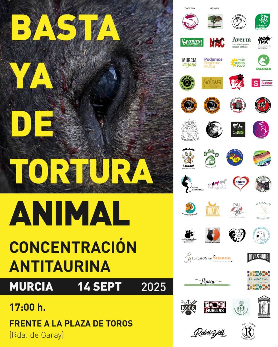 Jueves, 11 de septiembre de 2025.- La “Coordinadora de los Derechos Animales de la Región de Murcia”, con el respaldo de más de 50 colectivos sociales y animalistas de toda la Región, convoca a la ciudadanía a participar en una concentración antitaurina frente a la Plaza de Toros de Murcia el próximo domingo 14 de septiembre a las 17.00 horas, con motivo del inicio de la Feria Taurina de la capital del Segura.