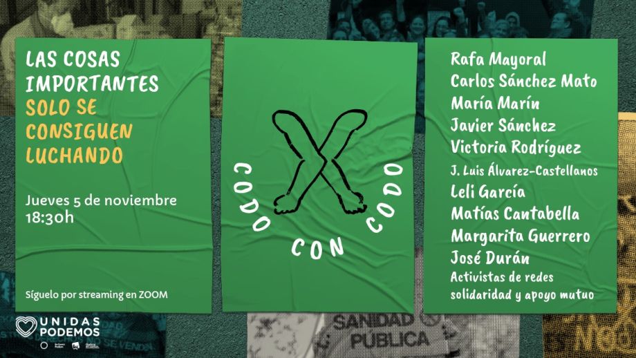 Tras años caracterizados por las medidas de recortes que, tras la crisis de 2008, esquilmaron los bolsillos de los sectores populares y de amplias capas de la mayoría social en España, las medidas programáticas acordadas po el Gobierno de Coalición han supuesto un avance en materia de derechos.A principios de enero nadie podía prever que en menos de dos meses se declararía un estado de alarma como consecuencia de la crisis global de la COVID-19.La presencia de Unidas Podemos en el Gobierno ha sido clave para que las medidas que se están tomando desde el primer momento no olviden que en esta crisis nadie puede quedarse atrás y que, a diferencia de lo sucedido en la anterior, en esta ocasión la salida no puede ser el deterioro de las condiciones de vida de las familias trabajadoras.Además de la crisis de la COVID-19, afrontamos un contexto político y social en el que vivimos bajo la amenaza principal de sufrir una involución democrática por parte de las élites financieras y determinadas fuerzas reaccionarias.Ahora tenemos la tarea principal de reconstruir lo común, lo que fue arrasado por años de recortes, privatizaciones y políticas para beneficiar a una minoría enriquecida por políticas injustas.’Codo con Codo’ quiere ser un espacio para establecer dinámicas de participación y diálogo con la militancia, que permitirá conocer y compartir las líneas políticas de la actualidad del momento, así como las de la etapa de reconstrucción y de profundización democrática en la que nos encontramos.Desde este espacio, podremos apoyar el tejido social y fortalecer el movimiento popular en los territorios, a la vez que damos a conocer el trabajo de intervención social que se está llevando a cabo, para que sirva como ejemplo en otros lugares y realidades concretas, y siempre sobre el fundamento ideológico de que sin tejido social, no se puede.Nuestra tarea como militantes será participar en las asambleas, reuniones y actividades que se organicen desde este espacio en los diferentes territorios, virtuales o presenciales, así como animar a militantes, activistas y simpatizantes de Unidas Podemos a sumarse a la iniciativa en nuestro entorno más inmediato.💻 Participa a través de Zoom