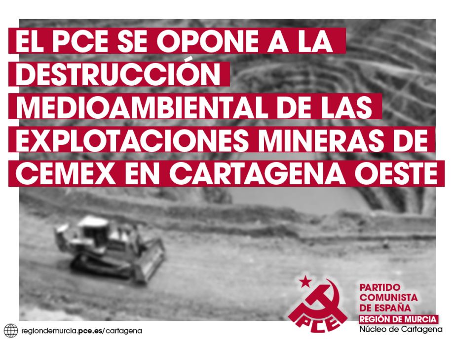 Cartagena, 5 de Septiembre, 2023 – Debido a las noticias conocidas en las últimas semanas sobre la posible extracción de materiales puzolánicos en la zona oeste de Cartagena, por parte de la multinacional CEMEX, la formación del Partido Comunista en la ciudad portuaria han declarado en redes sociales que “estos hechos nos muestran la necesidad del capitalismo de explorar nuevas zonas de reservas de recursos naturales ante un planeta finito, que como la clase obrera, se encuentra sometido a la ampliación incesante de ganancias para unos pocos, mientras que las mayorías sociales están cada día más precarizadas”.