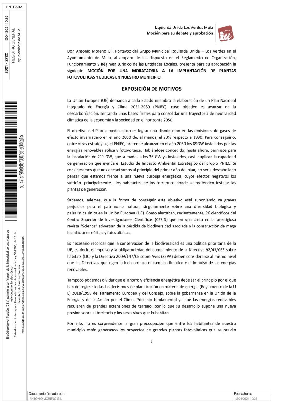 MULA: IZQUIERDA UNIDA VERDES MULA LLEVARÁ ESTE MES DE ABRIL UNA PROPUESTA AL PLENO PARA ESTABLECER UNA MORATORIA EN LOS PROYECTOS DE LAS MACRO-PLANTAS FOTOVOLTAICAS QUE SE PRETENDEN INSTALAR EN NUESTRO MUNICIPIO