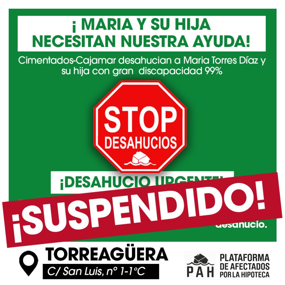 Murcia, 9 de febrero de 2025.- La Plataforma de Afectados por la Hipoteca (PAH) ha conseguido suspender el desahucio previsto para este lunes 10 de febrero en Torreaguera (Murcia), tras intensas gestiones y movilizaciones ciudadanas. María Torres Díaz y su hija, con un 99% de discapacidad, podrán quedarse en su vivienda gracias a la intervención de la plataforma y el apoyo de la ciudadanía.