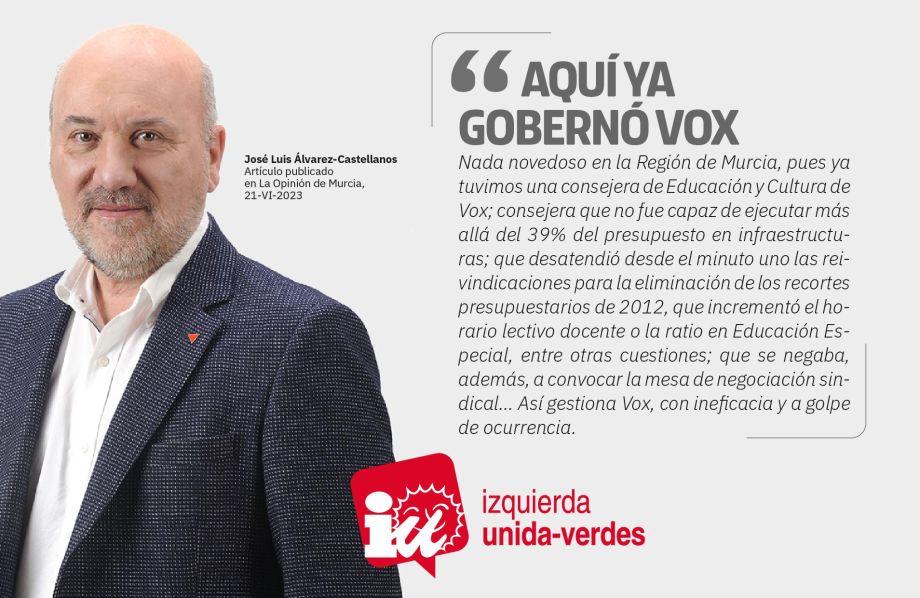 Nada novedoso en la Región de Murcia, pues ya tuvimos una consejera de Educación y Cultura de Vox; consejera que no fue capaz de ejecutar más allá del 39% del presupuesto en infraestructuras educativas, dejando de invertir 30 millones a pesar de contar con la cofinanciación del 86% del total presupuestario a cargo del Estado y de la UE; que desatendió desde el minuto uno las reivindicaciones para la eliminación de los recortes presupuestarios en educación producidos en 2012, que incrementaron el horario lectivo docente o la ratio en Educación Especial, entre otras cuestiones; que se negaba, además, a convocar la mesa de negociación sindical, suscitando la unánime petición de cese por parte de las organizaciones sindicales de la Junta de Personal Docente en varias ocasiones; que impulsó y secundó una moción de su grupo parlamentario (Vox) para prohibir y sancionar el uso del lenguaje inclusivo de género en la administración regional, proponiendo corregirlo en los libros de texto porque, según ella, «dificulta la comprensión de los niños».