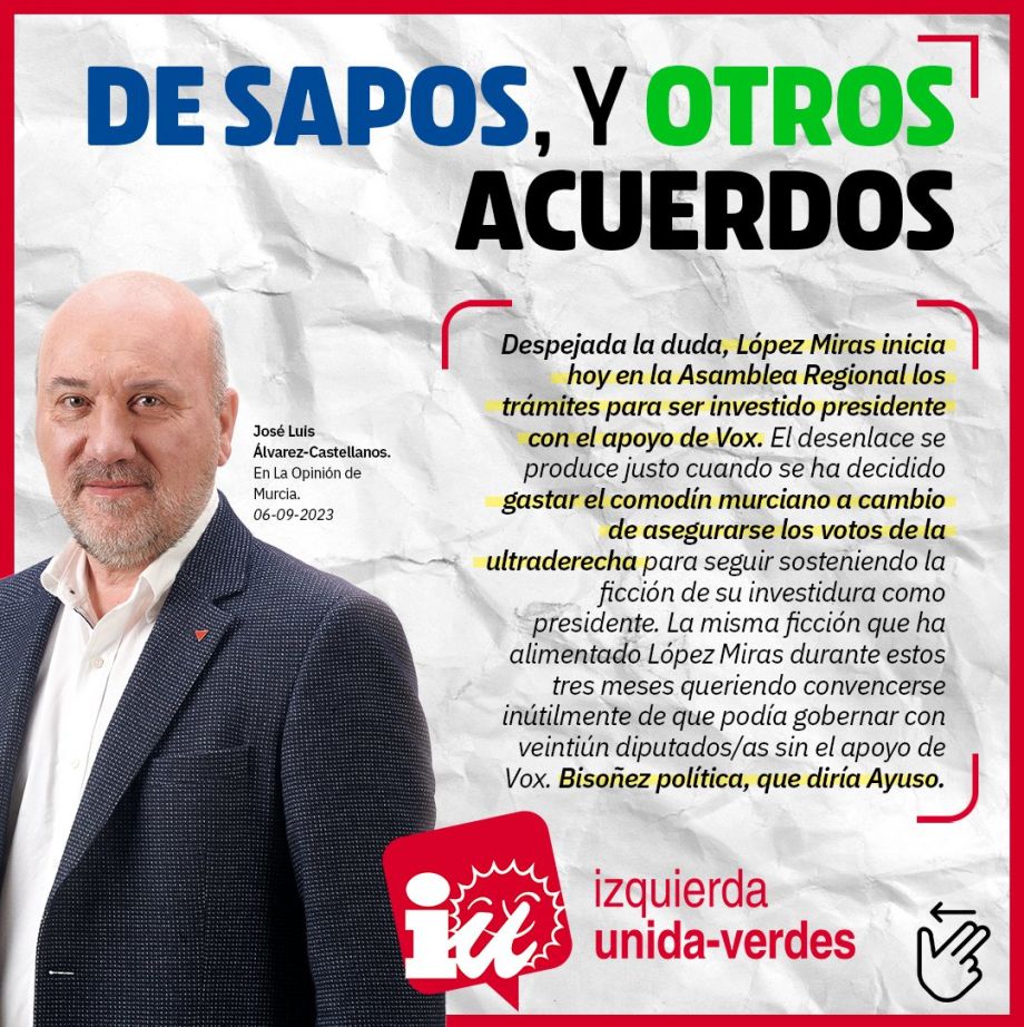 Despejada la duda, López Miras inicia hoy en la Asamblea Regional los trámites para ser investido presidente con el apoyo de Vox. El desenlace se produce justo cuando Feijóo ha decidido gastar el comodín murciano a cambio de asegurarse los votos de la ultraderecha, para seguir sosteniendo la ficción de su investidura como presidente. La misma ficción que ha alimentado López Miras durante estos tres meses queriendo convencerse inútilmente de que podía gobernar con veintiún diputados/as sin el apoyo de Vox. Bisoñez política, que diría Ayuso.