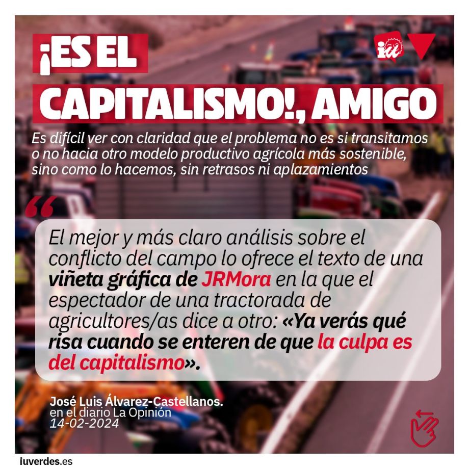 El mejor y más claro análisis sobre el conflicto del campo lo ofrece el texto de una viñeta gráfica de JRMora en la que el espectador de una tractorada de agricultores/as dice a otro: «Ya verás qué risa cuando se enteren de que la culpa es del capitalismo».