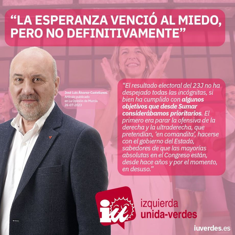 Este último objetivo está todavía en ciernes, pero sale en nuestra Región muy reforzado, tanto por el resultado electoral, que ha permitido revalidar la representación ya obtenida en elecciones anteriores, como por la experiencia del trabajo conjunto y colaborativo, esta vez sí, de todas las organizaciones políticas que en otros momentos han sido absurdamente competidoras entre sí. Todo ello amalgamado por el liderazgo ilusionante de Yolanda Díaz y un proyecto de país cuyas propuestas nos sitúan como modelo de políticas progresistas en Europa.