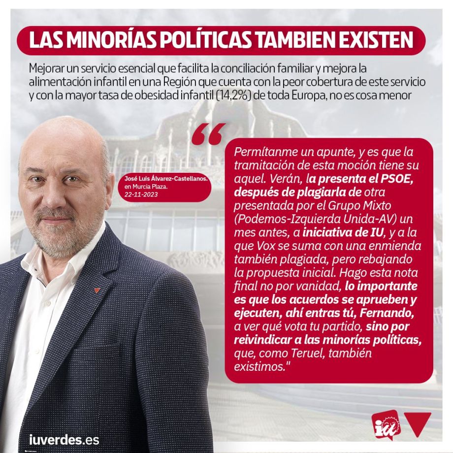 Por fin un asunto que tiene que ver con los problemas del día a día pasa por la tribuna de la Asamblea Regional. Aunque parezca un tema menor, con lo que está cayendo, no lo es, al menos por dos razones. La primera, porque mejorar un servicio esencial que facilita la conciliación familiar y mejora la alimentación infantil en una Región que cuenta con la peor cobertura de este servicio y con la mayor tasa de obesidad infantil (14,2%) de toda Europa, no es cosa menor; máxime cuando, además, ostentamos la tercera mayor tasa de riesgo de pobreza infantil del país (INE 41,4%), +13,3 puntos sobre la media estatal.