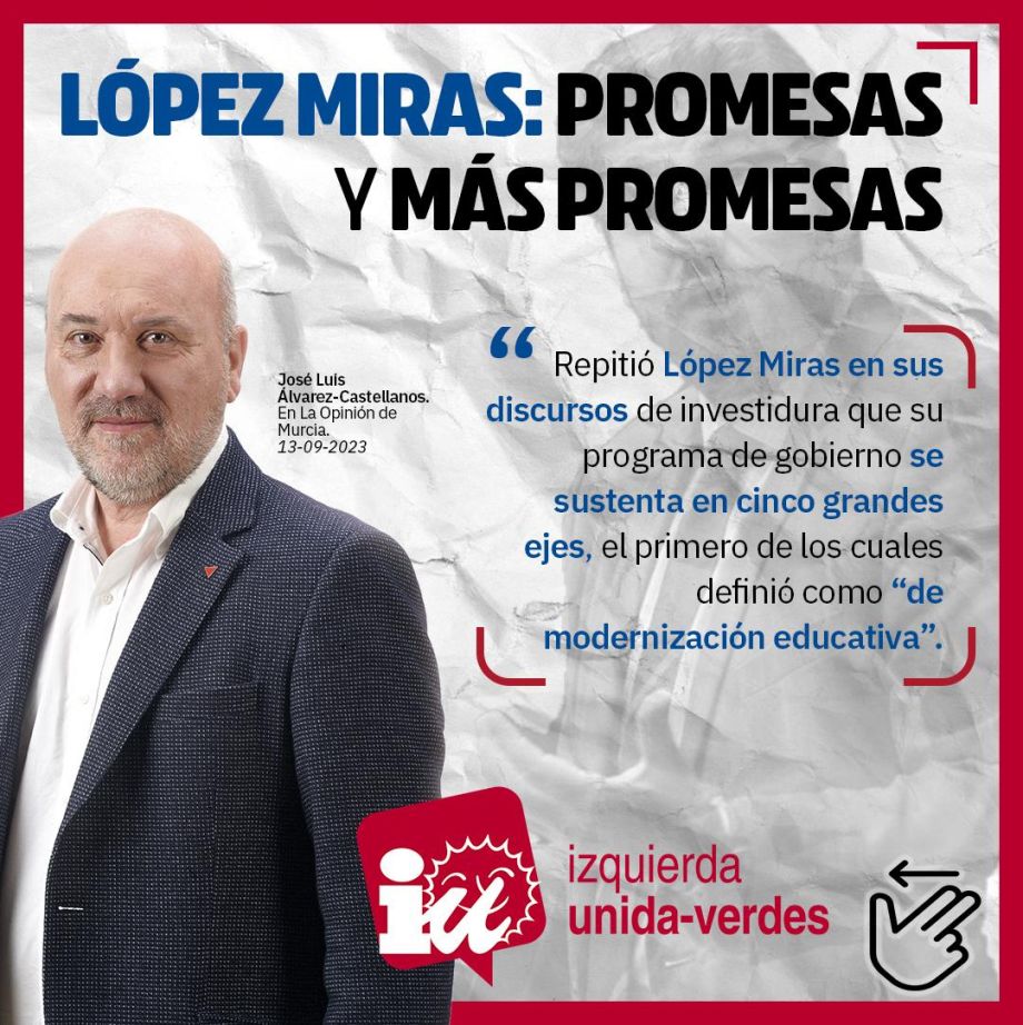 Sentenció entonces: «El porvenir de la Región de Murcia se forja cada día en las aulas de nuestros colegios e institutos». Prometió «trabajar sin descanso para mejorar la tasa de abandono escolar temprano», invertir en un Plan de Infraestructuras Educativas, mejorar de las condiciones laborales de los docentes, ofrecer alternativas al alumnado a través de la FP y disponer más y mejores servicios educativos. Hasta un pacto ofreció en aras del necesario consenso para alcanzar estos retos.