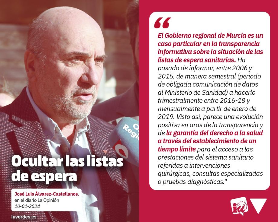 El caso es que vamos camino de repetir la misma situación de ocultamiento de los datos de dichas listas, superado ya con creces el mes de diciembre de 2023 y con la web del SMS anclada en los datos de junio. Conocer esta información quizás pueda parecer baladí, pero no lo es, quien tiene que esperar 206 días de media para una consulta con un especialista, como ocurre en el Área III de Salud de Lorca, lo sabe bien; como también lo saben los 85.283 pacientes sin tan siquiera una fecha asignada para una consulta especializada o prueba diagnóstica.