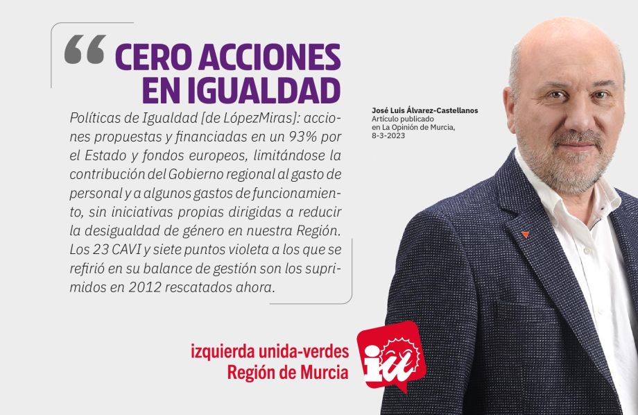 Mientras, el Gobierno regional arrincona su propia Ley de Igualdad (2007), una de las principales herramientas para mitigar esta situación: el Instituto de la Mujer sigue suprimido, no se aprueban los Planes de Igualdad para la Administración regional (solo está en vigor el sectorial de Sanidad, no así el de Administración y Servicios caducado en 2021 y ni el de Educación, sin revisar desde que LM es presidente) y no se compromete a impulsar la aprobación de Planes de Igualdad también en el ámbito empresarial, donde no llegan a un tercio las empresas de nuestra Región obligadas a tenerlo que dispongan del mismo; como tampoco trabaja por la implantación de un modelo educativo que incorpore la perspectiva de género (Art.30)