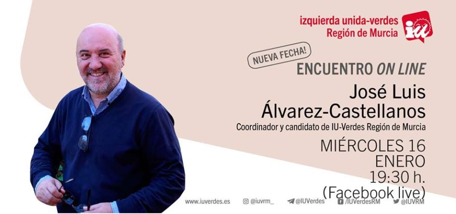 Apúntate el miércoles 16, realizaremos un Encuentro online con nuestro Coordinador José Luis Álvarez-Castellanos, candidato de IUVRM a la Asamblea Regional, donde podrás preguntarle y aportar lo que consideres.