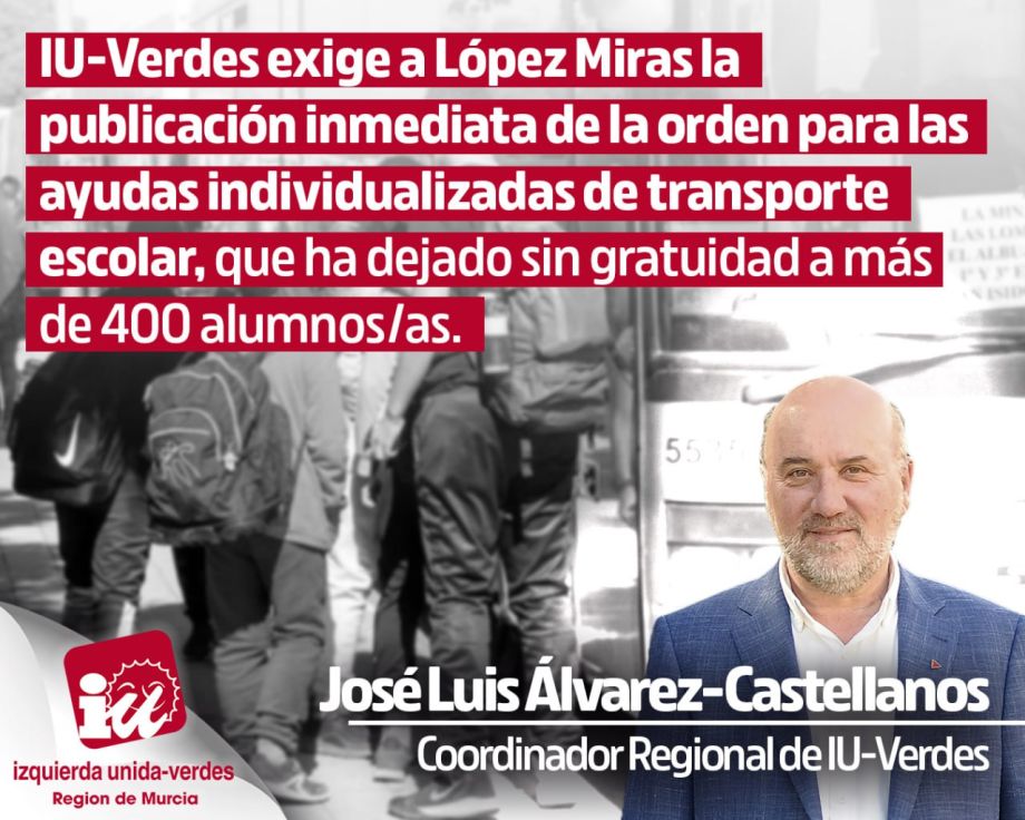 IU-Verdes exige a López Miras la publicación inmediata de la orden para las ayudas de transporte escolar, que ha dejado varados a más de 400 alumnos/as.
