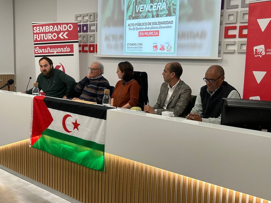 Murcia, Miércoles 28 de enero de 2026.- La sede regional de Comisiones Obreras en Murcia se llenó ayer de militancia, solidaridad internacionalista y memoria histórica, al acoger un acto organizado por Izquierda Unida-Verdes Región de Murcia (IU-Verdes) y el Partido Comunista de la Región de Murcia (PCRM) en apoyo al pueblo saharaui. Representantes del Frente Polisario estuvieron presentes, acompañados de sindicalistas, activistas y representantes políticos, en una jornada marcada por la denuncia de la ocupación marroquí y la reivindicación del derecho de autodeterminación del Sáhara Occidental.