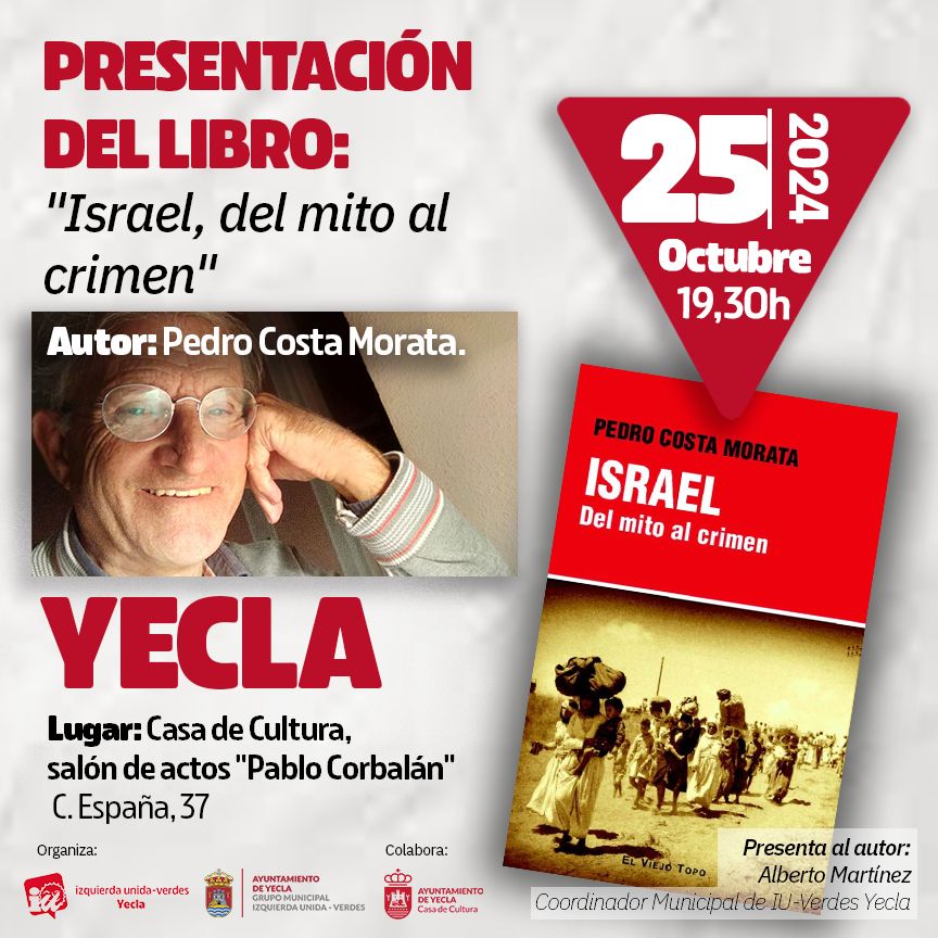 Izquierda Unida-Verdes realizará el próximo día 25 de octubre a las 19:30 horas en el salón de actos “Pablo Corbalán” de la Casa de Cultura un acto sobre el genocidio que está cometiendo el Estado de Israel. Así, el acto consistirá en la presentación del libro “Israel. Del mito al crimen” escrito por Pedro Costa Morata y editado por El Viejo Topo.