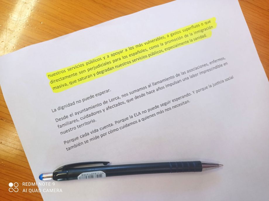 La portavoz de VOX intenta “colar” en el Pleno de Lorca una “declaración institucional” sobre la enfermedad del ELA de contenido xenófobo, afirmando, con falsedad, que se la habían hecho llegar las asociaciones de enfermos