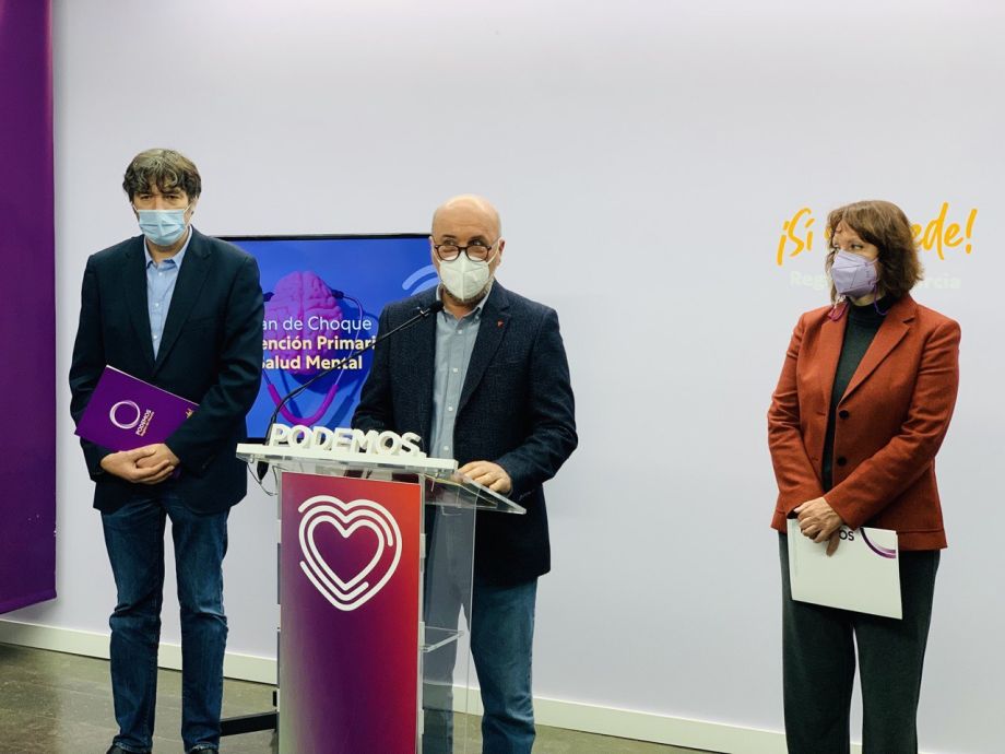 Unos presupuestos regionales que ignoran por completo la pandemia y que dejan fuera a la mayoría social de la comunidad autónoma. Así han calificado desde Unidas Podemos el proyecto de cuentas autonómicas de López Miras para 2022. La portavoz morada en la Asamblea Regional, María Marín, ha presentado junto al diputado Rafael Esteban y a José Luis Álvarez Castellanos, coordinador regional de Izquierda Unida Verdes, las enmiendas que la formación ha registrado a los presupuestos autonómicos para el próximo año, con los que esperan “dar respuesta a las necesidades reales de la Región de Murcia”, que “no están ni mucho menos recogidas en el proyecto de López Miras y su coro de tránsfugas”, quienes “un año más siguen escuchando exclusivamente a sus redes clientelares y pensando en sus propios intereses partidistas”. Marín ha explicado que desde Unidas Podemos se han presentado 79 enmiendas, alterando sustancialmente el contenido de los presupuestos, y que tienen como primer eje la defensa de la sanidad pública “frente a un modelo que recorta en salud”. La diputada ha denunciado que el Gobierno regional “pretende despedir a más de 700 sanitarios en plena sexta ola de la pandemia”. Desde Unidas Podemos han registrado hasta doce enmiendas relativas al apartado de la salud, entre las que se incluyen una para poner en marcha “de forma inmediata” un Plan de choque para el refuerzo de la Atención Primaria. También pretenden impulsar otro plan de choque inmediato para la salud mental, una demanda que procede de colectivos de sanitarios y la sociedad civil y que “es absolutamente fundamental”. La portavoz de Podemos ha asegurado que estamos ante dos pandemias, después de que durante los últimos meses se haya puesto de manifiesto que la salud mental “se está convirtiendo en otra pandemia después de la covid”.