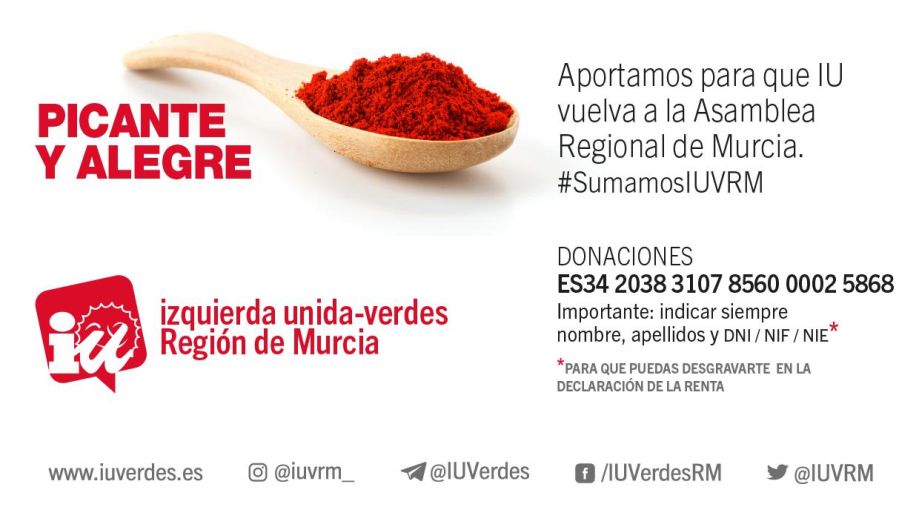 Como ya sabéis, en Izquierda Unida-Verdes hemos decidido no recurrir a préstamos bancarios para sufragar nuestra campaña electoral. Por ello, lanzamos esta campaña con la intención de que, gracias a vuestras aportaciones, nuestra organización esté lo mejor preparada posible para afrontar el reto de volver a la Asamblea Regional y poder defender desde allí los derechos que juntos luchamos en las calles.