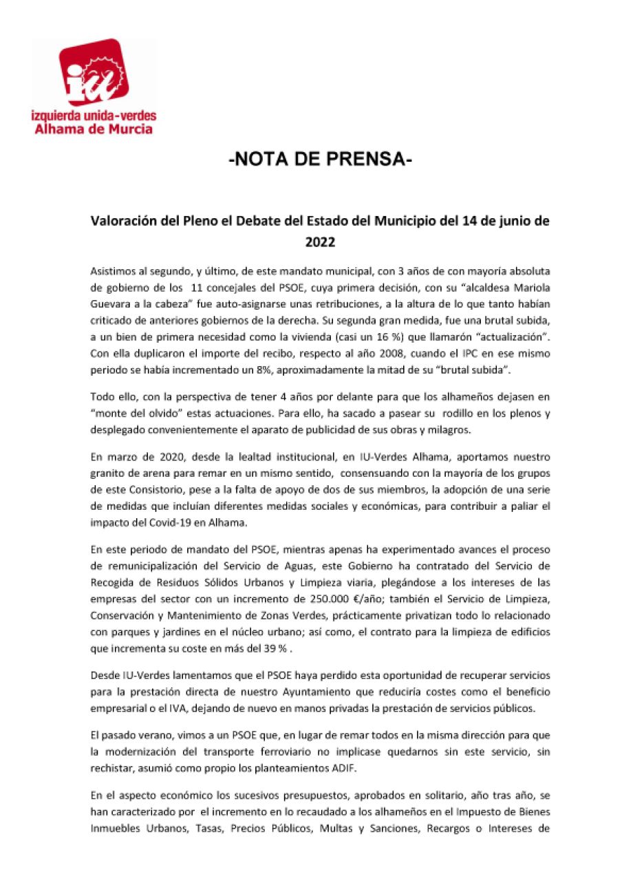 Valoración del Pleno el Debate del Estado del Municipio del 14 de junio de 2022