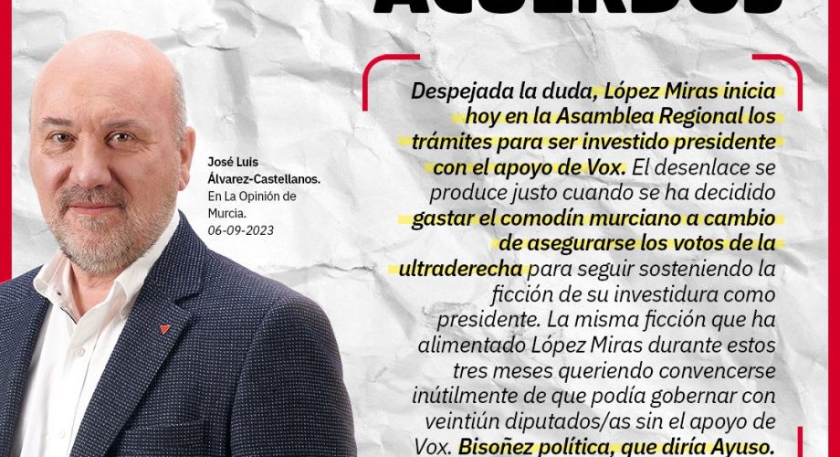 Murcia – 08 de Septiembre, 2023. – El Partido Comunista de España en la Región de Murcia califica de “tenebroso, ultra, negacionista y antisocial” el acuerdo del PP y VOX para la...