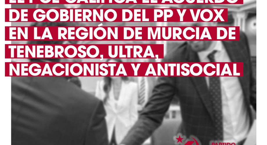 El PCE califica el acuerdo de gobierno del PP y VOX en la Región de Murcia de tenebroso, ultra, negacionista y antisocial.